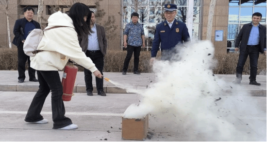 演练期间,预设在2楼的某实验室,某位女同学在发生用火用电安全事故之后,产生了窒息现象。此时,浓烟触发安全警报,警报声响起。同学们在老师的有序指导之下,在浓烟之中捂住口鼻,有序撤离现场。医护人员第一时间将担架抬至事故现场,并进行了第一步的安全检查,之后迅速将受到事故伤害的女生送至安全区域。随后,在消防员同志和老师的介绍之下一起听讲,并演示了灭火器的使用原理、使用方法。其中不少同学勇于尝试,扑灭火焰使用并体验了消防器材的使用方法。在此过程中,物理电程工程学院老师同学配合紧密,圆满地完成了本次演练目的。全体同学在老师的紧张有序地指挥下,疏散出教室,按照规定路线迅速撤离,到教学楼底下集合。整个演练过程按预定方案进行,达到预期的目的。消防员同志为师生讲解了干粉灭火器的使用方法。师生认真观看了现场灭火器的实验演示,部分师生现场参与了灭火实验操作。