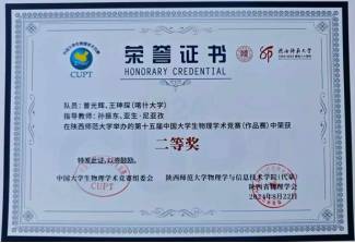 2024年8月18日至23日,第十五届中国大学生物理学术竞赛(China Undergraduate Physics Tournament,CUPT)全国赛在陕西师范大学成功举办。来自全国95所高校的96支代表队的800余名师生获得资格参加了本次CUPT比赛。由曹丽萍教授领队、孙振东和亚生·尼亚孜老师指导的曾光辉与王珅琛组成的喀什大学代表队首次参加CUPT作品赛国赛荣获二等奖和最佳人气奖,标志着七年来我校CUPT的积累与发展成绩再上一个新台阶。CUPT作为我校打造的品牌赛事,成为培养高素质复合型创新物理人才和孕育学科交叉合作的平台与摇篮,为奋力建设新疆一流现代化喀什大学贡献了物理学科建设的新篇章。