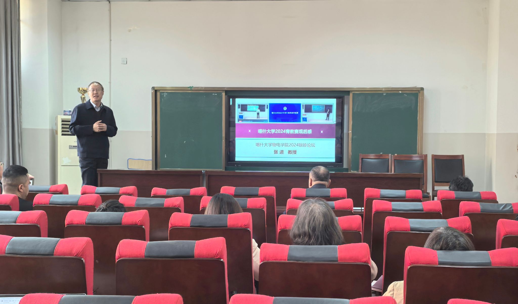 为了更好地发挥银龄教师在教学工作的积极作用,2024年10月23日,物电学院银龄教师张进教授为物电学院全体教师做题目为“以赛促教-喀什大学2024青教赛观后感”的讲座。讲座由物电学院党委书记王继新主持,物电学院全体教师参加了讲座。