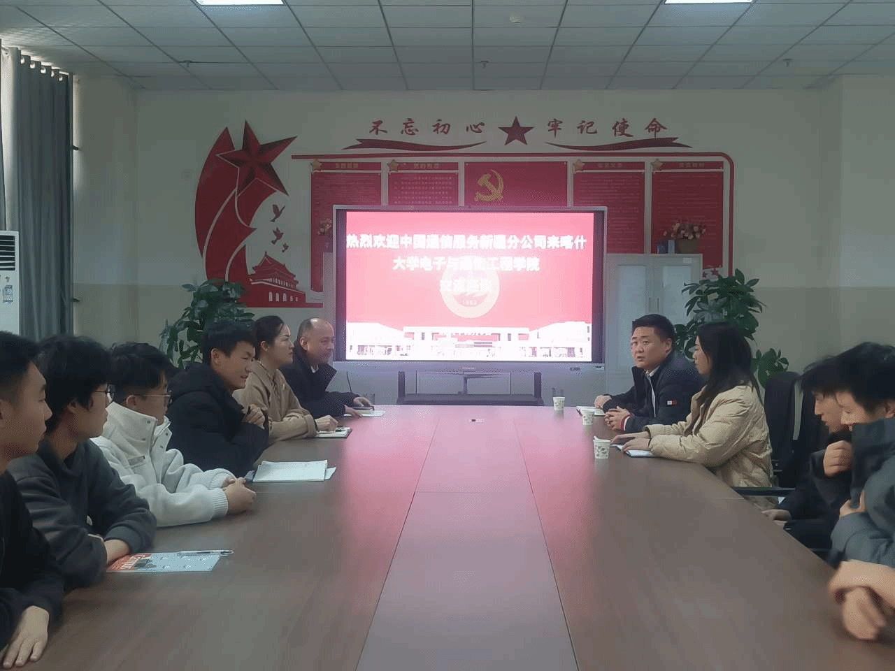 2024 年 12 月 5 日,中国通信服务喀什地区分公司总经理黄炀一行到访学电子与通信工程学院,开展交流座谈活动。学院党总支副书记吾买尔·海孜尔、学工办主任沈琴、团委副书记栾彦奎及就业专干阿依努尔携已被企业录取的 2025 届毕业生代表参与此次座谈。