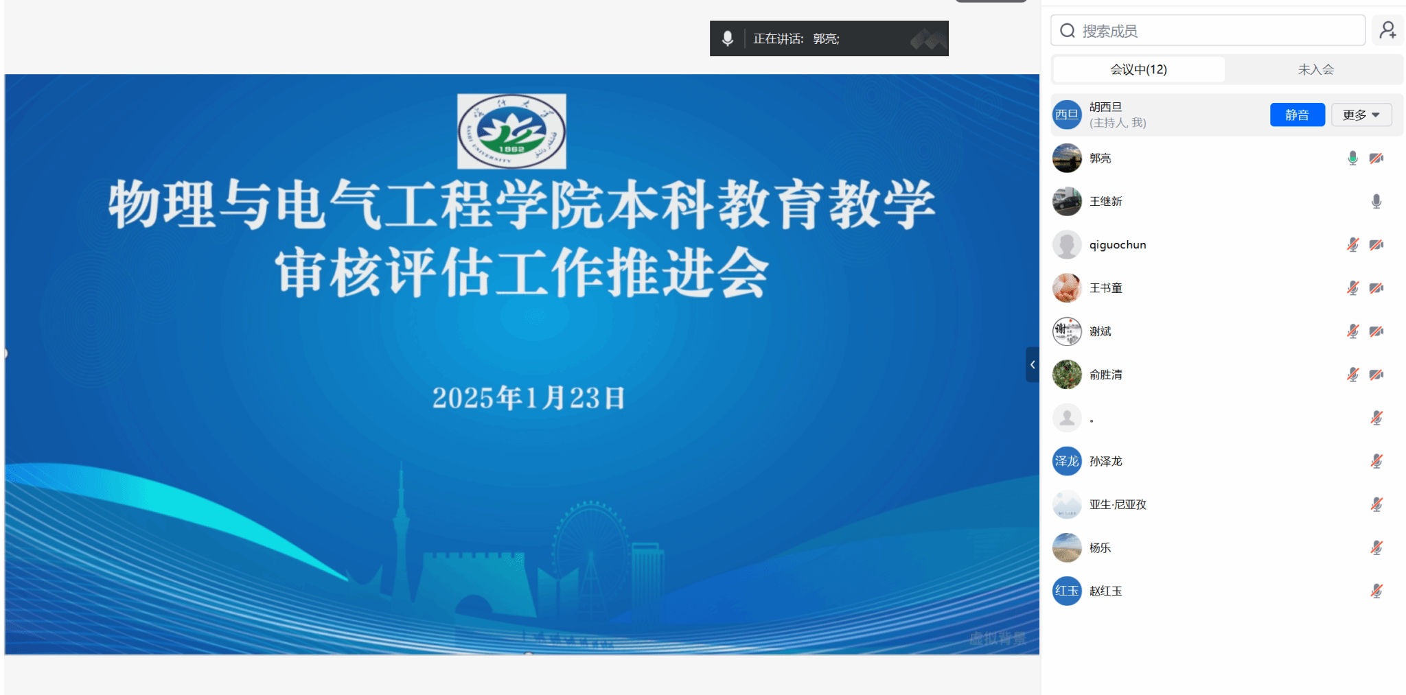 2025年1月23日,物理与电气工程学院在线上组织召开本科教育教学审核评估工作推进会。本次会议由物理与电气工程学院党委副书记、院长郭亮同志主持,学院领导班子成员、各教研室主任、教学秘书及相关团委人员参会,旨在准备下学期审核评估工作的各项工作,明确下一阶段工作重点,确保学院顺利通过审核评估。