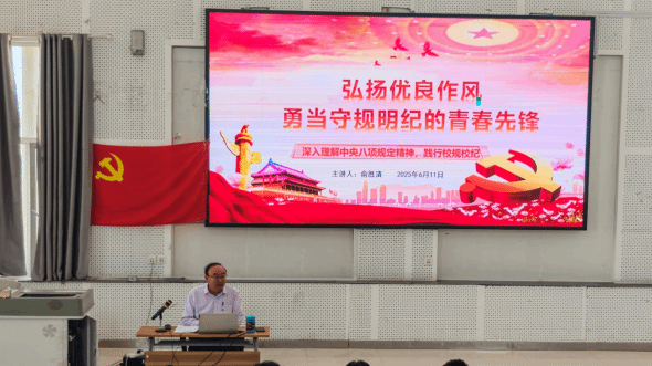 为深入引导学生学习中央八项规定精神,践行校规校纪,培养全面发展的新时代青年,推动校园文化建设与社会发展,物理与电气工程学院党委副书记俞胜清同志于2025年6月11日在院楼A416开展了“弘扬优良作风,勇当守规明纪的青春先锋”为主题党课。此次党课旨在落实中央八项规定精神,发挥党员模范作用,营造风清气正的校园风气,培育全面发展型人才。