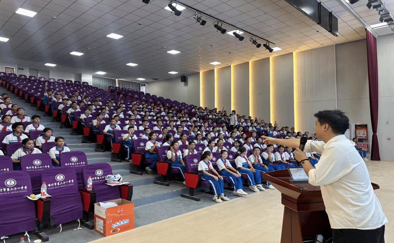 本次实践融合高校文化体验、新疆生态保护教育、趣味科学实验及素养拓展活动,致力于为青少年突破语言能力提升与教育视野拓宽的关键瓶颈提供系统性支持。活动伊始,我院“喀大聚能,疆韵新生”实践团走进二十一中充满好奇心的中学生课堂,以“喀大聚能,疆韵新生”暑期社会实践活动为主题,开启一场融合边疆文化与科学探索的旅程。活动开场,学院团委纪钰祺老师向同学们介绍此次实践活动的目的和意义,富有感染力的开场讲话瞬间点燃了学生热情,为课堂注入蓬勃活力。