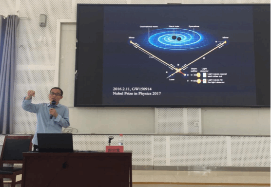 郭研究员从老师同学们每天都在使用的手机里的电磁波出发解释了电磁波和引力波同属四种基本相互作用的长距离相互作用波,但是引力波相当微弱几乎很难探测到。报告还介绍了对毫赫兹频段的引力波进行直接探测、我国的另一个空间引力波探测计划天琴计划。他指出引力波探测为人类探索宇宙打开了一扇新窗口,同时也将为探索暗能量的本质提供了重要的理论支撑。